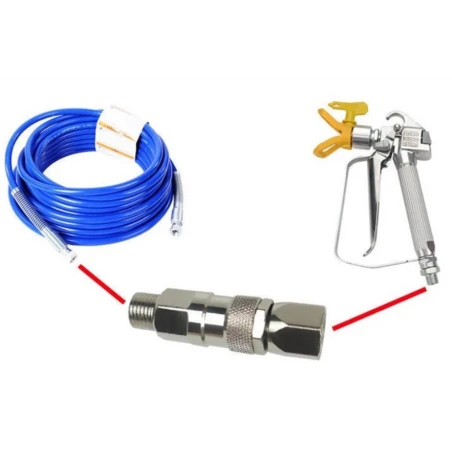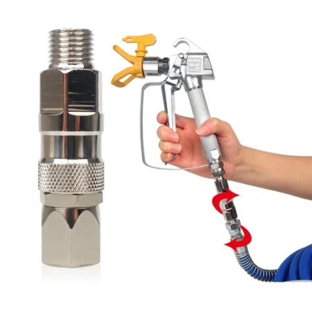 Esta junta giratória fornece conexão entre o aerossol e a mangueira de tinta sem ar. Com movimento rotativo de pulverização livre, reduzindo a fadiga durante a pulverização. Rotação de 360 graus.
