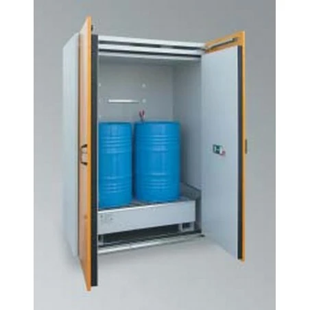 Armario ignífugo «RF 90» para 2 bidones de 220 litros, con dimensiones exteriores de 1.550 x 1025 x 2.200. Construido y aprobado según EN 14470-1 (RF 90 – Resistencia al fuego >90 minutos). Protección de acuerdo con DIN 4102. Interior del armario pintado en RAL 7035 (gris) y exterior en RAL 1007 (Amarillo). Placa de base en acero inoxidable. Puertas con cierre térmico automático. Conexión de ventilación DN 75 para una extracción del aire en el interior del armario. Dispositivo de apertura de emergencia. Marcado CE.