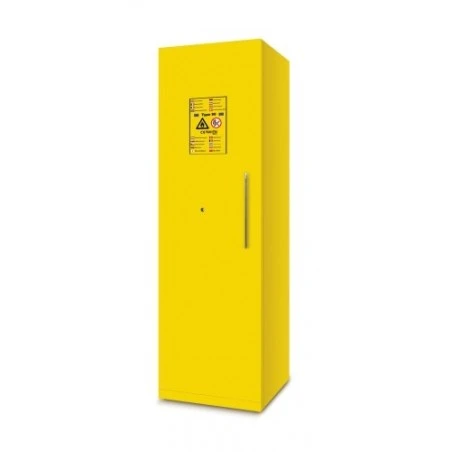 Armario Ignífugo RF 90 con dimensiones 595 (largo) x 600 (ancho) x 2.055 (Alto) perfecto para la protección de líquidos inflamables. Construido y homologado por GS según EN 14470-1 (RF-90), marcado CE, con una resistencia al fuego mayor a 90 minutos. Aislamiento según DIN 4102. Acabado RAL 1007. Altura de los estantes con cubeta ajustable a intervalos de 64 mm, aseguradas contra el vuelco de líquidos, con una capacidad de 22 litros. Capacidad por balda de 80 Kg. Conexión para extracción/entrada de aire (AN 75). Cierre térmico automático de la puerta.