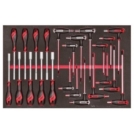 El Juego de destornilladores vaso y llaves T TTEX23 – 23p de Tengtools, código 283280105, incluye destornilladores de vaso, llaves hexagonales (Allen) y TX con mango transversal. Estas herramientas se colocan en un inserto de espuma EVA que tiene tres capas de diferentes colores. Se adapta a las cajas de herramientas y carros Tengtools.