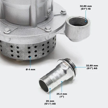 También la eliminación de partículas más pequeñas, ya que el diámetro de la manguera mide 25,4 mm. La carcasa de aluminio hace que la bomba sea estable y persistente.