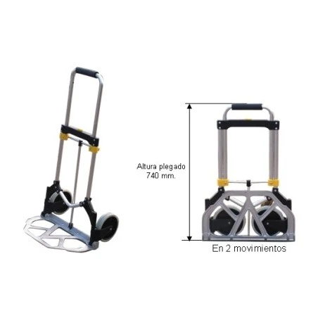 Carro completamente plegable. Ocupa muy poco espacio (solo 55 mm de grosor). Muy ligero (4,1Kg). Ruedas elásticas. Carro listo para su uso instantáneamente, las ruedas y la pala se despliegan conjuntamente. Capacidad de carga hasta 70Kg.