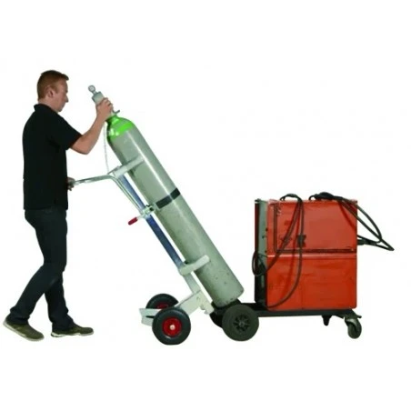 Carro perfecto para el transporte de una botella de soldadura, posee ruedas neumáticas de Ø 260.