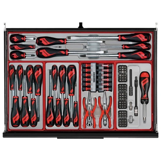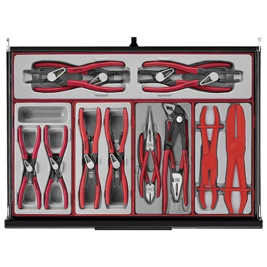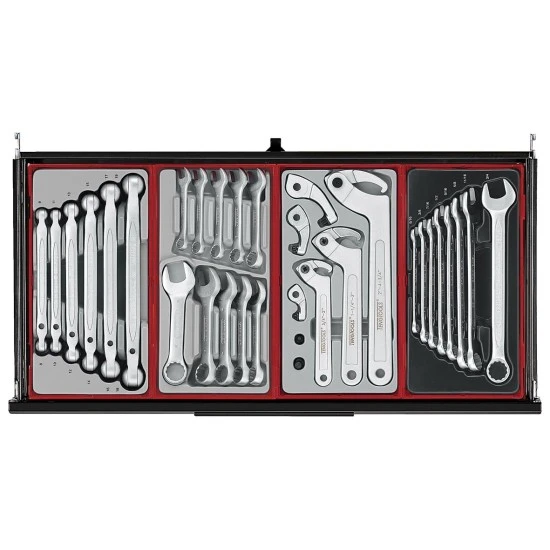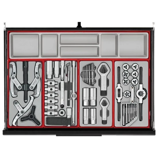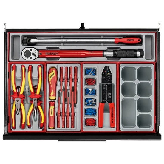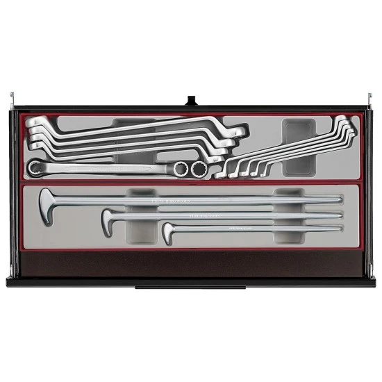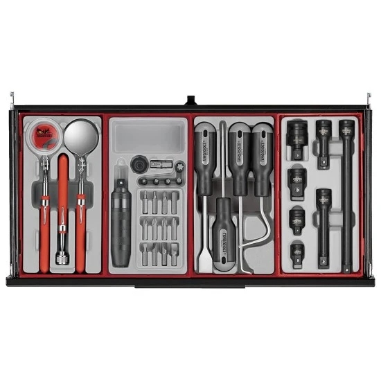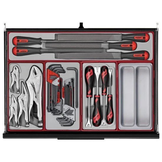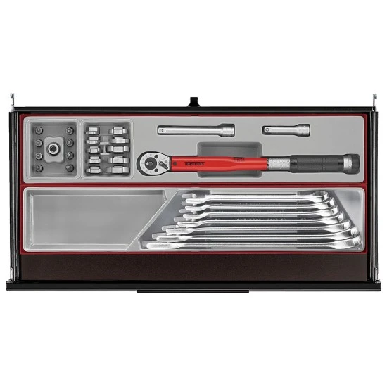 Con una construcción robusta y un diseño versátil e inteligente, el Carro de herramientas TKS26B1033T incluye tres unidades apiladas de acero con 16 cajones totalmente extensibles con guías con cojinetes de bolas y capacidad de carga de 30 kg por cajón y, gracias al sistema de control de herramientas modular Tengtools, tendrá una organización eficiente de las herramientas y será, además, fácil identificar los elementos faltantes.