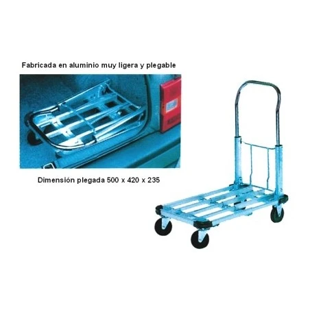 Carro plegable, fabricado en aluminio y muy ligero, con protectores en las esquinas y con mango auto-ajustable. Dimensiones plegado 500 x 420 x 235.