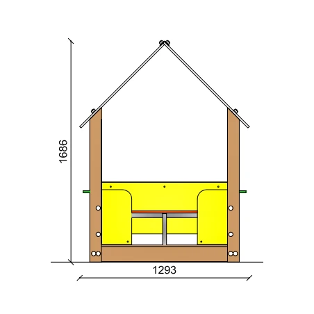 La estructura está realizada con postes de pino nórdico de 90×90 mm, cuyas esquinas son redondeadas (r. 10 mm). El piso es de CRPY, mientras que el techo y las paredes son de HDPE coloreado.