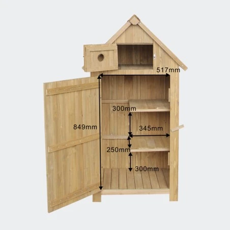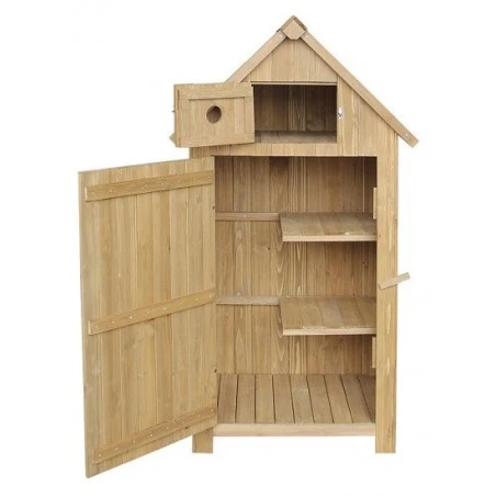 Caseta de jadín adeciada para guardar los juguetes de los peques o las herramientas de jardín. De madera y con tejado de alquitrán.