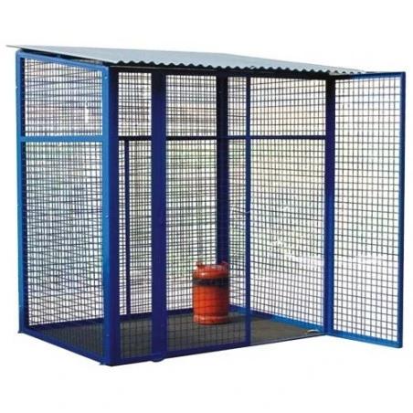 Caseta de seguridad, fabricada en acero, malla lateral con una luz de 50 x 50 para una perfecta visualización del contenido de la caseta. Muy utilizada para el almacenamiento de productos peligrosos. Techo inclinado, ojal para candado, puertas de 950mm. Sin suelo.