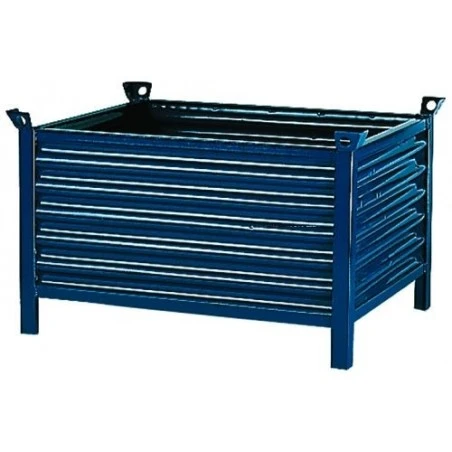 Contenedor realizado en chapa de acero de 2 mm de espesor, útil para grandes cargas hasta 2.000 Kg y reforzado mediante pliegues nervados en forma de «V» en los laterales y en su base.