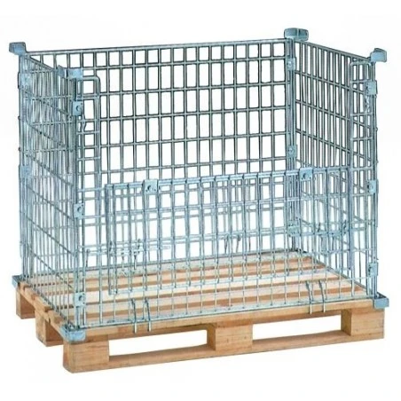 Cestón plegable para poner en un palet de madera, perfecto para utilizarlo en el almacenaje de todo tipo de mercancías de consumo, recambios, etc. Es apilable sobre si mismo y completamente plegable sobre su misma base. Acabado superficial zincado electrolítico brillante. Capacidad de Carga hasta 800 Kg. otras alturas disponibles. Se suministra sin palet.
