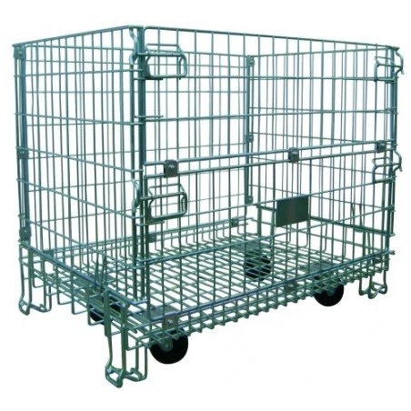 Contenedor metálico ideal para utilizarlo para la exposición y/o almacenaje de todo tipo de mercancías de consumo y recambios. Es apilable sobre si mismo y completamente plegable sobre su misma base. Acabado superficial zincado electrolítico brillante. 4 Ruedas con Ø 125 de Nylon para un perfecto transporte del contenedor. Capacidad de carga hasta 800 Kg.