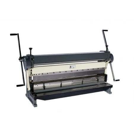 Cizalla, plegadora y curvadora de chapa con matriz de ribetear desmontable. Equipado con calibrador estándar posterior. Rodillos de arrastre ranurados. Herramienta muy robusta. Dos posiciones de palanca (izquierda – derecha).