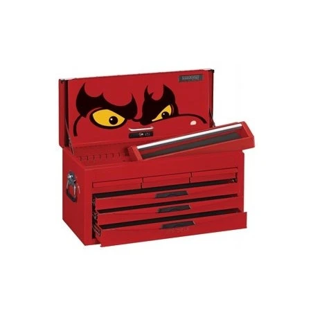 Cofre para guardar herramientas compuesto por 6 cajones con guías de rodamiento, cerradura de combinación y tapa superior que incluye un pequeña bandeja portaherramientas.