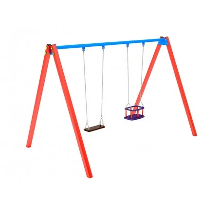Columpio clásico con dos asientos, una tableta y una canasta, que promueve la diversión y fomenta la socialización entre niños de diferentes edades. Sin duda el más clásico de los juegos de parque, el columpio es un elemento que no puede faltar en una zona de juego completa.