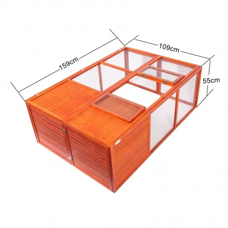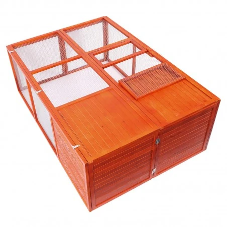 En la parte superior del recinto hay una abertura de dos puertas a través de la cual se puede alcanzar el interior de la jaula para limpiar el suelo o proporcionar alimentos. Si no se necesita la jaula en este momento, simplemente se puede plegar y guardar para ahorrar espacio.