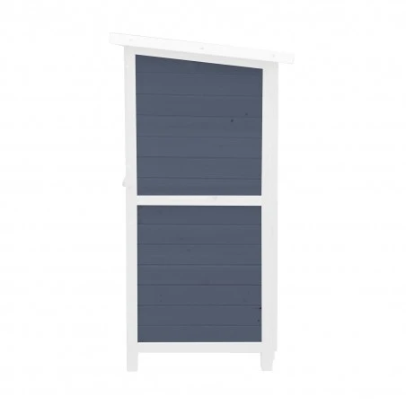 El establo está elevado sobre patas de madera y protege así a los pequeños animales del suelo frío y húmedo. La estructura de la platea es de madera pintada de gris. La estructura de madera está cubierta con una malla galvanizada que es resistente a la intemperie y permite una buena circulación del aire. El techo abatible está aislado con betún y protege a los animales de la lluvia.