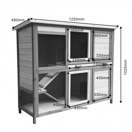 Mantener conejos, liebres y conejillos de indias de una manera apropiada para su especie requiere mucho espacio. Porque además del ejercicio diario, estos animales también necesitan un refugio espacioso donde estén protegidos de los depredadores y la intemperie. La conejera tiene dos niveles y puede complementar el mantenimiento de animales pequeños además de un gran recinto al aire libre.
