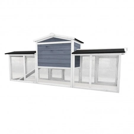 El establo y la rueda libre son fácilmente accesibles gracias a las diferentes puertas, lo que facilita el manejo y la limpieza. Convenientemente, el piso del establo es una bandeja de estiércol que se puede sacar y limpiar fácilmente. Los techos del establo y del corral están recubiertos con betún y protegen a los habitantes del establo de la lluvia.