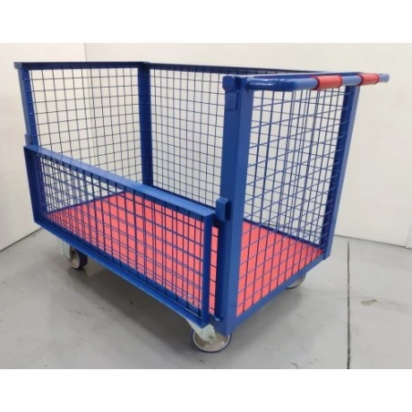 Contenedor con medio lateral abatible para cargas no superiores a 600 Kg, con luz 50×50 y una altura útil de 750mm, ruedas fijas y giratorias de goma que proporcionan una gran movilidad del contenedor. Laterales de malla reforzada, siendo de gran utilidad para el almacenamiento y transporte de mercancías en que se desea que sea visible su contenido. Contenedor para el almacenamiento y transporte de mercancías.