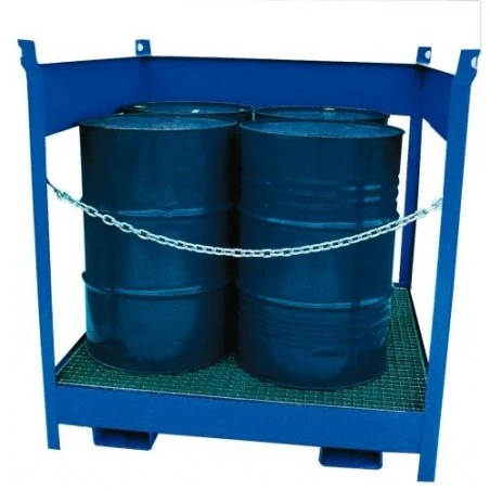 Contenedor para 4 bidones para carretilla, apilable y fabricado en acero muy resistente con cubeta para el derrame de residuos con una capacidad de 220 litros.