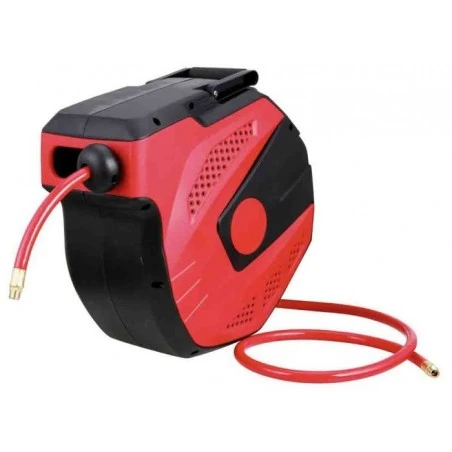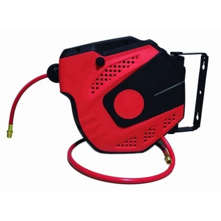 Enrollador de manguera para aire comprimido automático. Carcasa robusta de polipropileno. Manguera de PVC flexible. Soporte de pared, permite giro de hasta 180° a la izquierda o a la derecha. Guía de rodillos en la parte superior e inferior.
