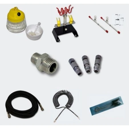 Los acoples rápidos para el intercambio de las tres armas de fuego, un práctico soporte, mangueras, el adaptador adecuado, puntas de repuesto de 0,2 y 0,5 mm y el agua del filtro de aire, hacen de este conjunto un paquete completo.