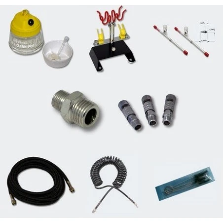 Los acoples rápidos para el intercambio de las tres armas de fuego, un práctico soporte, mangueras, el adaptador adecuado, puntas de repuesto de 0,2 y 0,5 mm y el agua del filtro de aire, hacen de este conjunto un paquete completo.