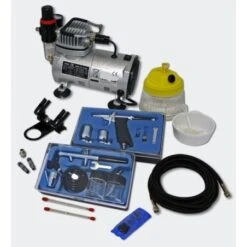 Los acoples rápidos para el intercambio de las tres armas de fuego, un práctico soporte, mangueras, el adaptador adecuado, puntas de repuesto de 0,2 y 0,5 mm y el agua del filtro de aire, hacen de este conjunto un paquete completo.