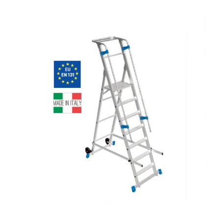En aluminio. Plegable con ruedas Ø 175 mm. Con peldaños de 80 mm, plataforma 470 x 370 mm.