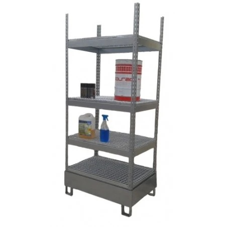 Estantería galvanizada con rejillas, especialmente indicada para el almacenaje de productos peligrosos. Resistente a la humedad. Capacidad de carga por balda de 65 kg. Cubeta galvanizada de retención 900 x 600 x 2.100 mm de 75 litros.
