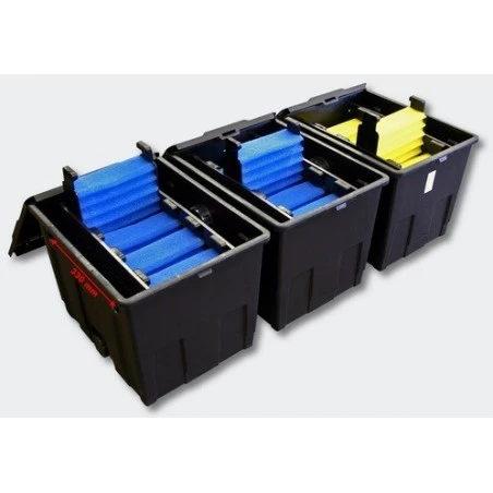 – Diferentes materiales de filtración (esponjas filtrantes especiales, estera japonés) simplemente apretar materiales de filtro permiten a través de un sistema de turnos.