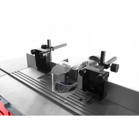 Fresadora de mesa de diseño compacto con rango de velocidad ajustable de 11500-24000min-1,altura del husillo ajustable de 0 a 40 mm, potente motor y varios accesorios de serie incluidos. Incluido en la entrega: pinzas para ø6, ø8 y 12 mm, 2 extensiones de mesa (para ambos lados), calibre de ingletes, tope/guía de fresado de aluminio, corredera de madera