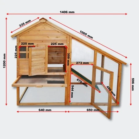 Este gallinero resulta muy práctico con dos plantas, para pequeñas y medianas razas, como liebres, conejos, pollos, cobayas y hamsters. Tiene una casa de un dormitorio separado y un techo de madera bien cerrado con aislamiento de betún. Un amplio recinto al aire libre con acceso privado a la parte delantera, y una rampa plana.