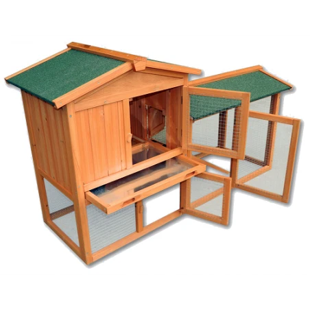 Este pequeño granero para animales es un granero de dos pisos muy práctico para razas pequeñas y medianas como liebres, conejos, gallinas, cobayas y hámsteres. Dispone de una caseta independiente para dormir y de un tejado de madera bien cerrado y con aislamiento bituminoso. Un amplio recinto exterior con acceso frontal privado y una rampa plana, estable y de fácil acceso proporciona a su mascota un hogar acogedor.