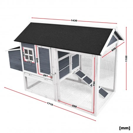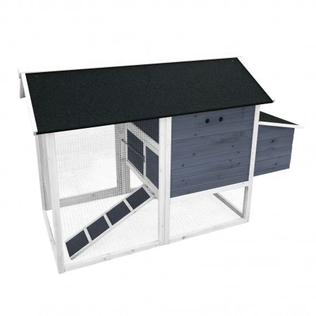 El gallinero está fabricado en madera de abeto y tiene unas dimensiones exteriores de 171 x 80 x 110 cm. La casa para dormir integrada ofrece una percha y el techo de madera bien sellado está aislado con betún, de modo que todo el complejo del gallinero está protegido de la lluvia. La limpieza fácil e higiénica es posible gracias a la bandeja de estiércol de chapa galvanizada, que se puede extraer. Una rampa antideslizante conecta la zona exterior con la casita. Para poder acceder a todas las áreas del gallinero para limpiar o revisar el nido, el nidal tiene un techo con bisagras y tanto el gallinero como el corral están equipados con una puerta.