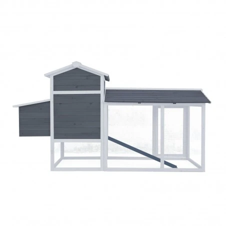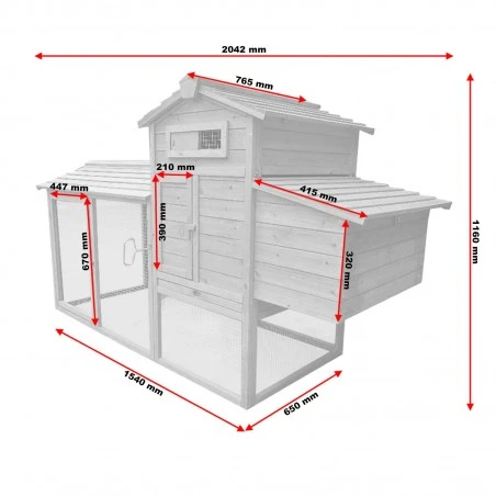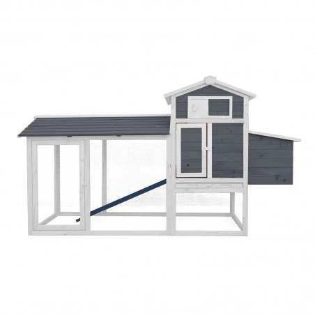 El gallinero grande tiene unas dimensiones exteriores de 204,2 x 76,5 x 116 cm (LxAnxAl). Las gallinas llegan al piso superior a través de una rampa con escalones de madera. Si los animales van a salir del establo, se puede abrir la puerta grande del patio libre. Para facilitar la limpieza de la casa, el suelo es desmontable. En el interior hay una bandeja para excrementos que es fácil de limpiar y desinfectar.