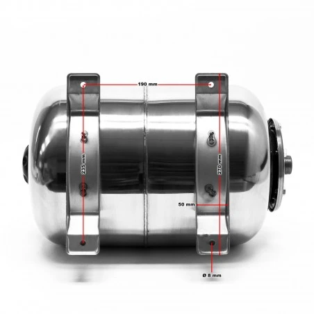 Hidroesfera de repuesto para su uso doméstico, adecuado para casi todas las plantas nacionales de agua, solares y sistemas de mantenimiento de presión y bombas de jardín. Este recipiente de presión de acero inoxidable será entregado con una membrana incluída y tiene una capacidad de 24 litros. El recipiente se diseña para una presión máxima de 5,4 bar y se entrega en una posición de acostado (horizontal). Tiene una conexión de 1 pulgada (32,89-33,25 mm) para una bomba. Además, el recipiente de presión de acero inoxidable viene equipado con una válvula integrada para inflar la membrana (reemplazable, apto para agua potable).