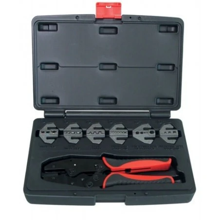 Contiene una pinza para engastar con un pico de fijación rápida suministrado con 6 juegos de mordazas diferentes. Pinza de acero con mordazas de alta calidad. Endurecido HRC 38-45. Los mangos están recubiertos de materiales 2 componentes PP+TPR para una agarre agradable y fuerte.