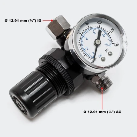 La válvula de reducción con una escala de 0 a 10 bar de presión tiene un roscado con llave y se puede ajustar de forma continua.