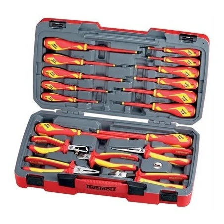 Un juego de alicates y destornilladores aislados de 18 piezas hasta 1000V.
