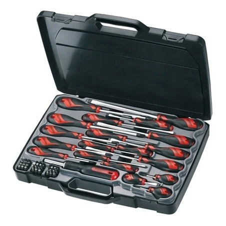 Maletín que contiene un práctico juego de destornilladores y puntas de 53 piezas. 10 destornilladores de boca estampada, 5 destornilladores de boca Phillips, destornillador de carraca para puntas con 6 puntas, y 27 puntas de diferentes tipos (longitud 25 m).