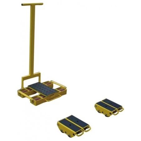 Tanquetas para utilizar en desplazamientos por el suelo de voluminosas y pesadas cargas hasta 14.000 Kg de forma segura y económica, por ejemplo calderas, grandes depósitos, pesadas máquinas, transformadores, vigas, construcciones, bastimentos, etc. Tanquetas con una altura de 105mm, con rodillos de poliuretano y cojinetes a bolas, tanquetas delanteras giratorias para un control total, superficie (de apoyo de la carga) antideslizante, resistente a impactos, no dañan el suelo, distribución plana del peso. Ligeras y compactas para su fácil transporte. Los conjuntos se componen de 1 tanqueta giratoria con timón y 2 tanquetas fijas, las tanquetas fijas disponen de agujeros pasantes para permitir la alineación mediante una barra.