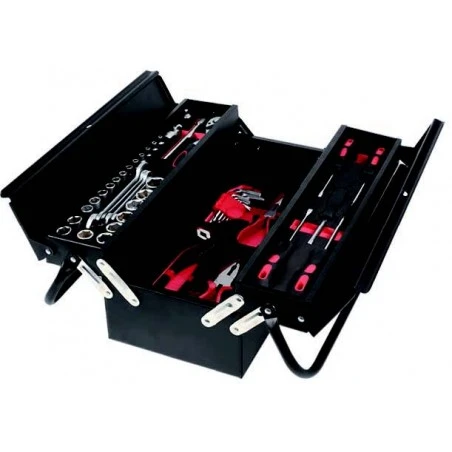 articulación universal 3/8”, 4 llaves fijas dos bocas (8×9, 10×11, 12×13, 14×15 mm, 9 llaves hexagonales 1.5-10, alicate boca larga 6″,