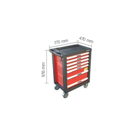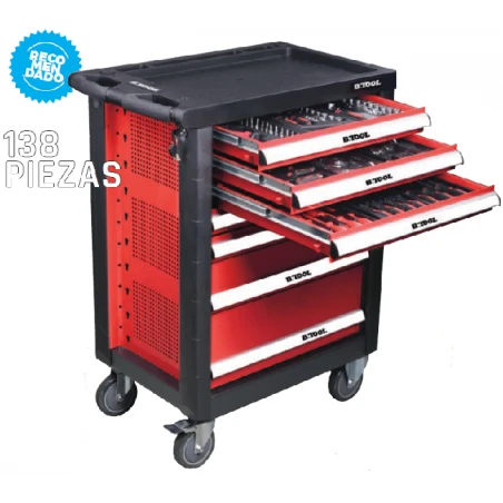 Carro de herramientas que contiene 138 piezas, distribuidas en los 3 cajones superiores de los 7 que dispone.