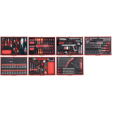 Completo kit de herramientas con todas las piezas con la figura de la herramienta precortada en espuma EVA de dos colores, con lo que verás fácilmente que la herramienta no está en su lugar. Suministrado en el carro TCW807N de 7 cajones con guías de rodamiento a bolas.