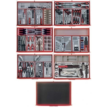 Juego de herramientas formado por 545 piezas que vienen colocadas en el carro TCW807N con ruedas y equipado con el panel TC-S01 y el conjunto de gancho TCW-HK20.