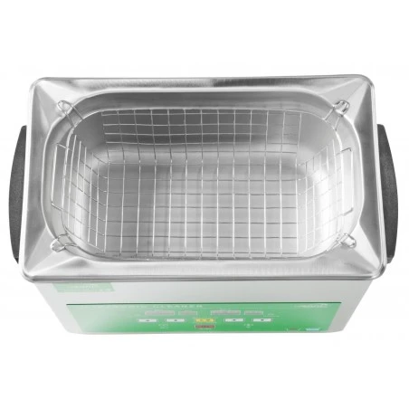 El limpiador ultrasonidos profesional MQT 3.0, cuenta con un grifo de vaciado que permite la salida del líquido sin entrar en contacto con la piel. Lapa de la limpiadora ultrasons está fabricada con acero inoxidable y tiene los ruidos del procedimiento. Esta tapa además acelera el proceso de calentamiento del líquido de limpieza. El recipiente de limpieza de acero inoxidable cuenta con una línea de demarcación de 2/3, que permite al usuario conocer en todo momento la cantidad óptima de líquido de limpieza que debe ser utilizada. La cubeta de acero inoxidable del baño ultrasonidos profesional MQT 3.0, en la que puede colocar los utensilios para limpiar, se suministra con el pedido.