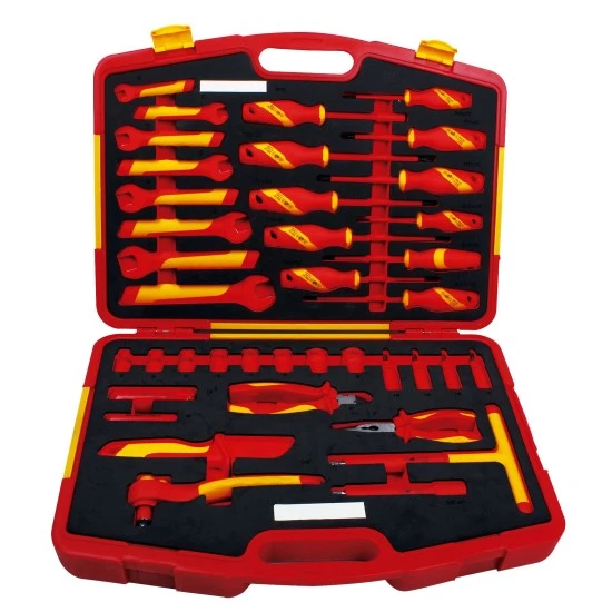 Las herramientas aisladas de este kit están fabricadas con los materiales más resistente. En total, son 39 piezas que incluyen desde llaves de carraca hasta destornilladores. Cumplen con norma VDE/IEC 60900 hasta 1000 V en AC y 1500 V en DC. Cada herramienta cuenta con un recubrimiento en colores llamativos que permite validar si se daña el aislamiento, para mayor seguridad. Se entrega en una práctica maleta de plástico que facilita su traslado y almacenamiento.