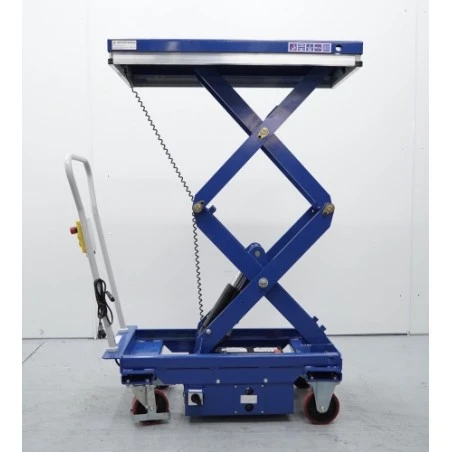 Mesa elevadora rodante con elevación eléctrica hasta 1.000Kg a batería, que permite trabajar a una altura cómoda para realizar tareas como manipulación, traslación, reparación, embalaje, control de piezas o productos, transporte de piezas en líneas de fabricación, etc.