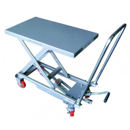 Mesa elevadora manual ALUMINIO de tijera rodante de 100Kg que permite trabajar a una altura cómoda para realizar tareas como manipulación, traslación, reparación, embalaje, control de piezas o productos, transporte de piezas en líneas de fabricación, etc. Con ellas ahorrará tiempo y facilitará enormemente el trabajo a realizar. La elevación se realiza mediante tijera a través de pedal. Descenso seguro y continuo mediante palanca. Chasis con 2 ruedas fijas y dos giratorias de poliuretano. Ruedas orientables protegidas y con freno.